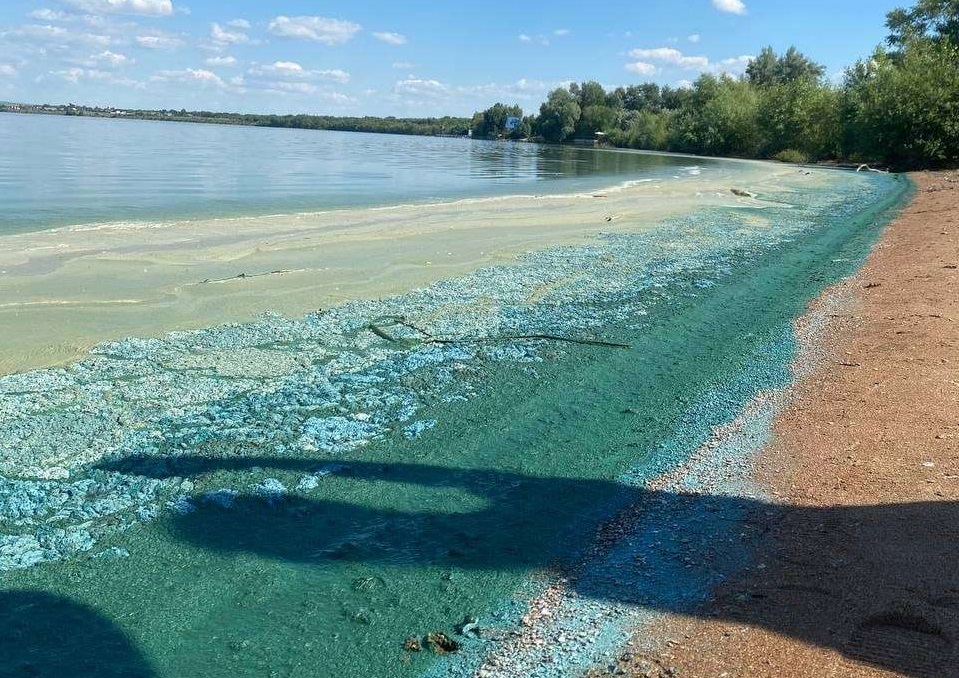 Жители Сорочинска сообщают в социальных сетях, что вода приобрела неестественно зелёный оттенок. Изумрудным стал и песок на берегу.