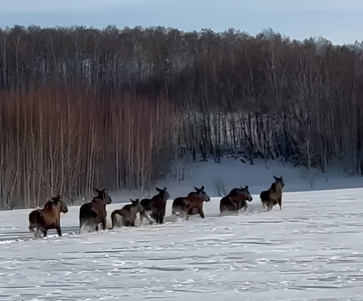 Жительница Тюльганского района Елена Шустикова поделилась в соцсети видео, на котором стадо из семи лосей движется через заснеженное поле в сторону леса.