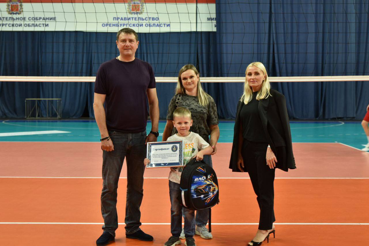 В набор вошли школьный рюкзак с канцелярскими принадлежностями, сладкое угощение и сертификат на семейные абонементы на домашние матчи команды «Оренбуржье» в сезоне 2025-2026.