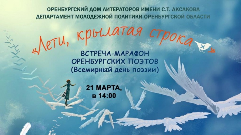 21 марта в 14.00 в молодёжном центре молла «Армада» (Шарлыкское шоссе, 1, IV галерея) состоится встреча-марафон оренбургских поэтов «Лети, крылатая строка».