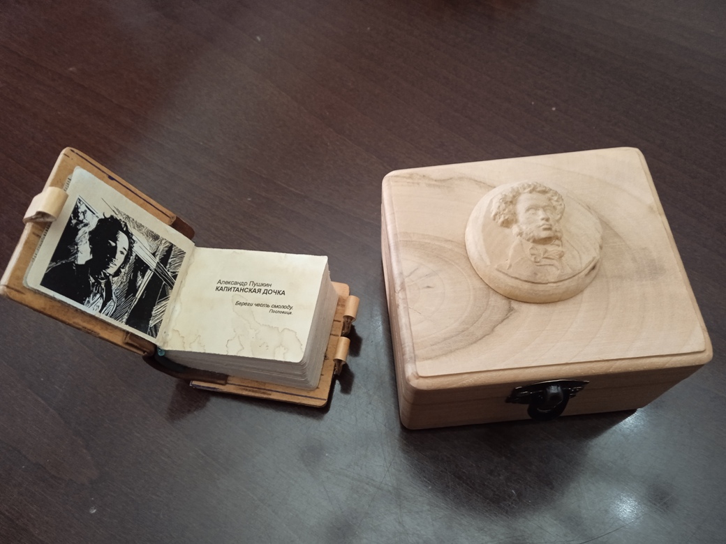 В подарочном футляре из дерева с вырезанным на крышке барельефом Пушкина, вложенными в футляр монетой времен Екатерины II и лупой, переплётом из кожи и бересты, минииздание стало 479 экземпляром коллекции, состоящей из «Капитанских дочек» на 42 языках мира.
