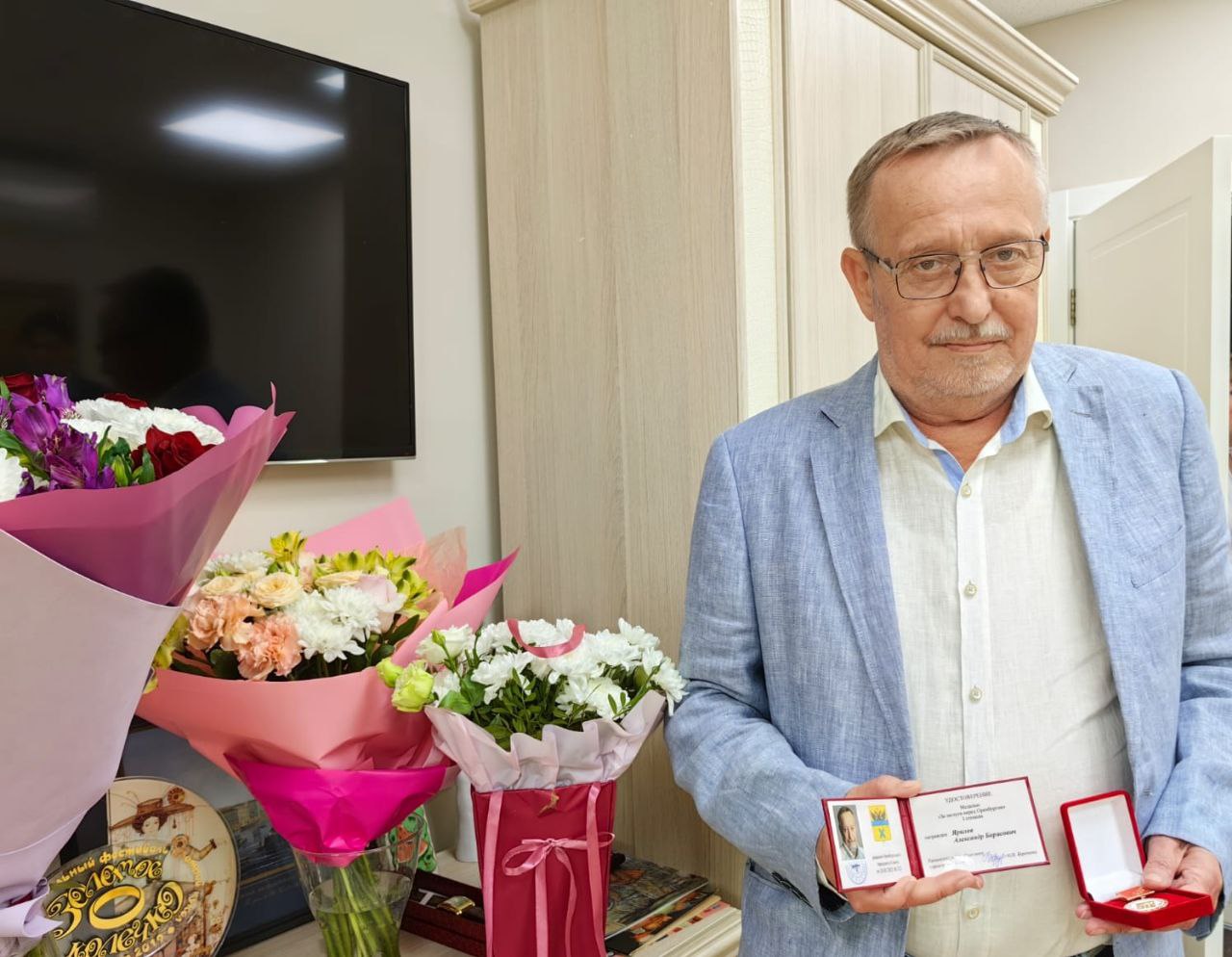 Вручение муниципальной награды состоялось сегодня, 14 мая, на торжественном вечере в театре, организованном по случаю 65-летия заслуженного артиста России. Медаль «За заслуги перед Оренбургом» I степени присвоена Александру Борисовичу за личный вклад в развитие культуры Оренбурга, многолетний добросовестный труд и высокий профессионализм.