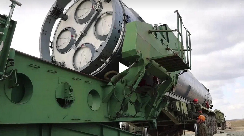 Межконтинентальная баллистическая ракета загружается в шахтную пусковую установку с помощью гидравлического механизма специального транспортно-загрузочного агрегата.