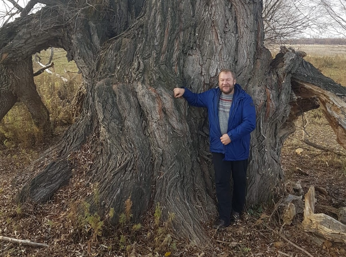 На фото: Турист и писатель из Петрозаводска Дмитрий Новиков у могучей ивы в окрестностях села Аблязово.