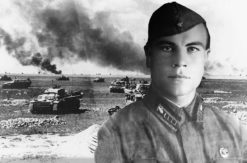 На голове будёновка, на шинели орден Красного Знамени, на воротнике треугольник с вышитыми цифрами «39». Будущий прославленный военачальник в 1920-е годы командовал 39-м Бузулукским кавалерийским полком.