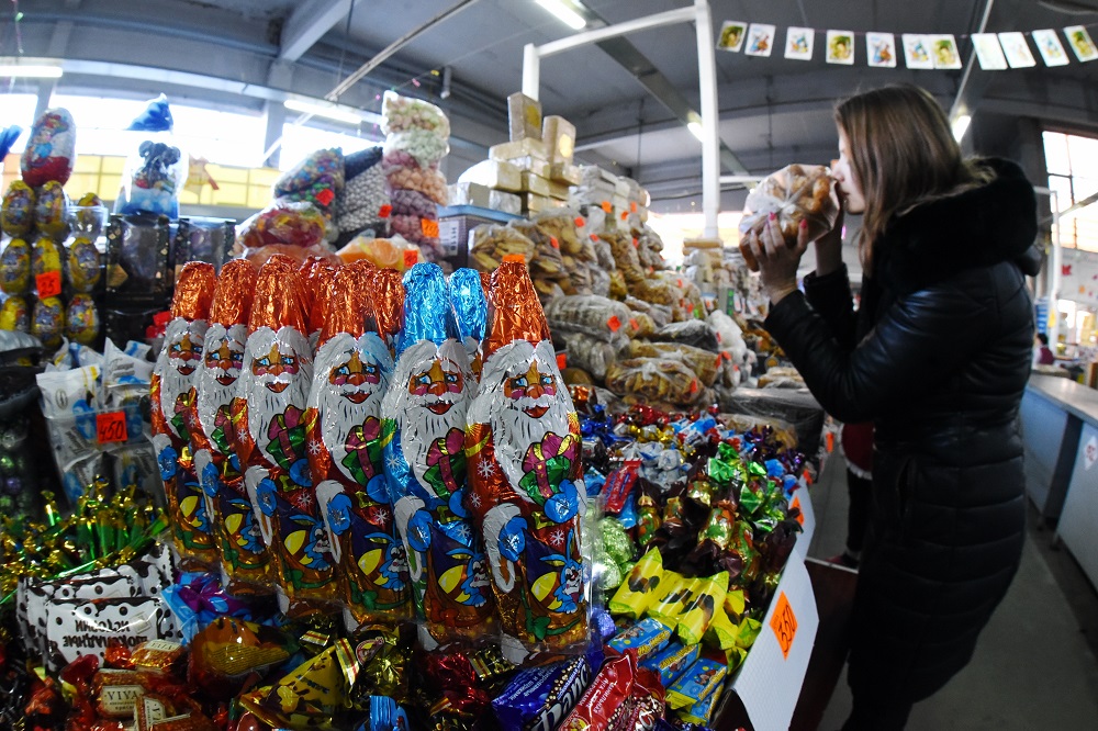 Продавцы рынка меня учат: горошек должен быть только мозговых сортов, а майонез – провансаль. Оставляю на рынке 400 рублей. Уходить отсюда не хочется, ловлю новогоднее настроение – павильон украшен мишурой и еловыми ветками, на прилавках – шоколадные Деды Морозы и мыши – символ года, горки разноцветных фруктов, одних только мандаринов видов 7 – 8.
