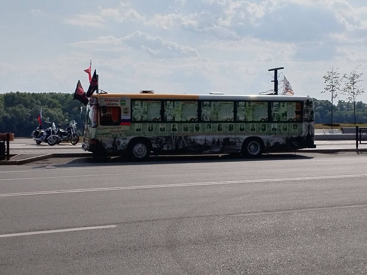 Экспозиция посвящена подвигу советского народа в Великой Отечественной войне. В автобусе размещены подлинные вещи участников ВОВ, плакаты, оружие. Автор проекта мотоциклист Василий Семёнов, его он посвятил памяти своего деда, Героя Советского Союза. В год 80-летия Сталинградской битвы мотоциклисты решили проехать от Благовещенска до Волгограда. По пути останавливаются в городах и проводят бесплатные экскурсии.