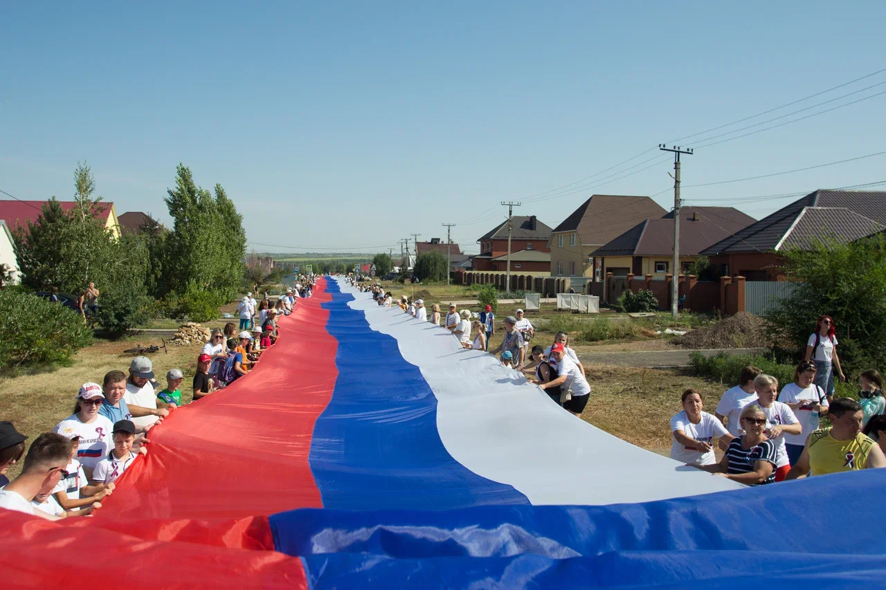 В Подгородней Покровке Оренбургской области развернули государственный флаг Российской Федерации длиной 1588 метров и шириной 4,5 метра, тем самым установив новый рекорд.