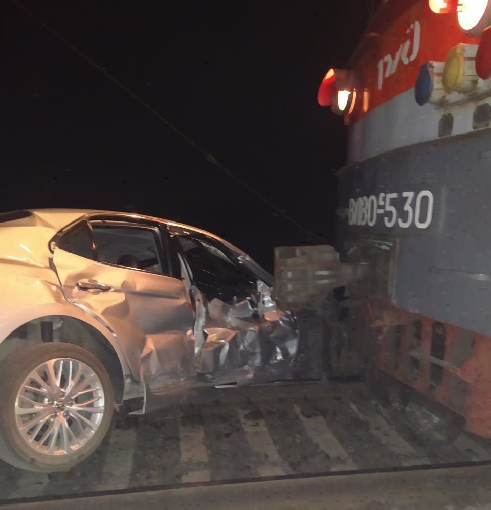 Машинист грузового поезда применил экстренное торможение, но легковушка всё-равно пострадала. Водитель машины отделался лёгким испугом.